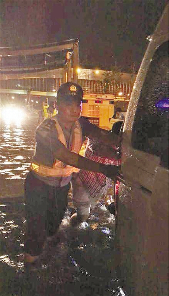 民警二话不说,迅速将公交车上的乘客背出车外,转移到地势较高的安全地带。正当大家都在忙着解救公交车上被困群众时,同协路上一辆路过的电瓶车因不知前方路况冲进积水中。民警厉刚将背上的被困群众刚刚放下,又赶去将电瓶车抬到安全地带。在确定没有人员被困并推移多辆抛锚车后,民警才离开。